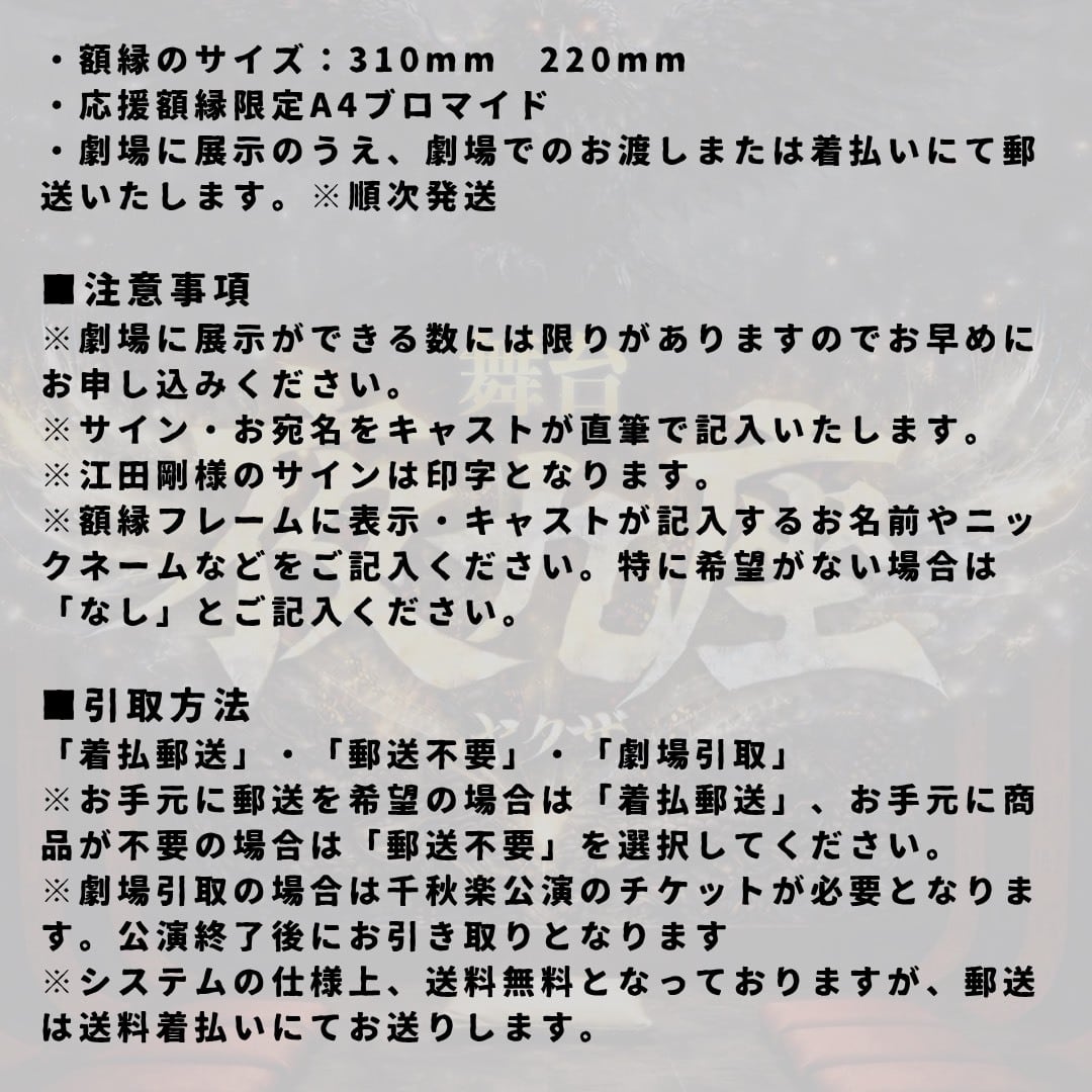 ※劇場引取の場合は、千秋楽のチケットが必要となります。公演終了後にお引き取りとなります。